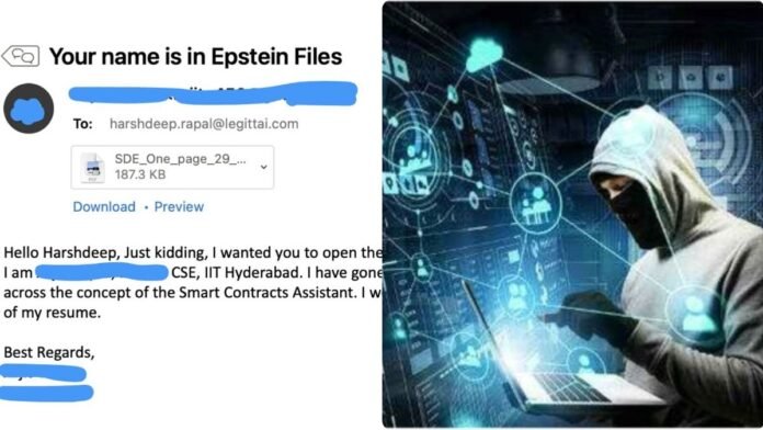 లెగ్గిట్ ఐఐ వ్యవస్థాపకుడు, సీఈఓ హర్షదీప్ రాపాల్.. ఐఐటీ హైదరాబాద్ విద్యార్థి తనకు పంపిన వివాదం ఈ-మెయిల్పై మండిపడుతూ సోషల్ మీడియాలో పోస్ట్ పెట్టారు. సదరు విద్యార్ది తన ఉద్యోగ దరఖాస్తు మెయిల్లో “మీ పేరు ఎప్స్టీన్ ఫైల్స్లో ఉంది” అనే టైటిల్ పెట్టి ఈమెయిల్ పంపాడు. దాన్ని తెరిచిన వెంటనే “Hello Harshdeep, just kidding, I want you to open the mail” అనే సందేశం కనిపించింది. అతను ఐఐటీ హైదరాబాద్ కంప్యూటర్ సైన్స్ అండ్ ఇంజినీరింగ్ విద్యార్థిగా తనను పరిచయం చేసుకుని, “స్మార్ట్ కాంట్రాక్ట్ అసిస్టెంట్” పోస్టు కోసం తన రెజ్యూమ్ పంపాడు.