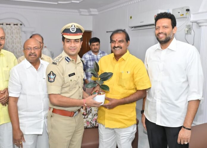 కర్నూలు జిల్లా ఇంచార్జ్ మంత్రి మరియు రాష్ట్ర జల వనరుల శాఖ మంత్రి నిమ్మల రామానాయుడుని కర్నూల్ జిల్లా ఎస్పీ విక్రాంత్ పాటిల్ కర్నూలు ప్రభుత్వ అతిథిగృహంలో మర్యాదపూర్వకంగా కలిశారు. ఈ సందర్భంగా మంగళవారం ఇంచార్జ్ మంత్రికి ఎస్పీ పూల మొక్కను అందజేశారు.