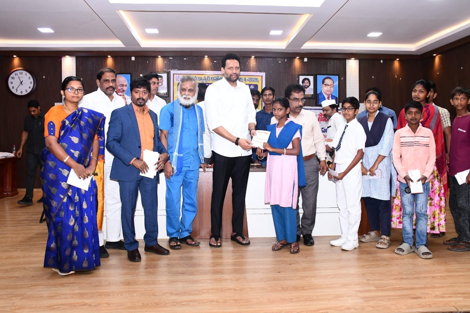 క్యాన్సర్ నియంత్రణకు అవగాహనే ప్రధాన ఆయుధమని, ప్రారంభ దశలో గుర్తిస్తే క్యాన్సర్ను పూర్తిగా అదుపులోకి తీసుకురావచ్చని రాష్ట్ర పరిశ్రమలు, వాణిజ్యం, ఫుడ్ ప్రాసెసింగ్ శాఖ మంత్రి టి.జి.భరత్ అన్నారు. బుధవారం ప్రపంచ క్యాన్సర్ దినోత్సవాన్ని పురస్కరించుకొని బచ్చు జానకిరాం ఫౌండేషన్ ఆధ్వర్యంలో స్థానిక ఎస్బీఐ ఎంప్లాయీస్ కాలనీలోని నగరపాలక సమావేశ భవనంలో పారిశుద్ధ్య కార్మికులకు క్యాన్సర్ వ్యాధి లక్షణాలు, నివారణ మార్గాలు, ముందస్తు పరీక్షల ప్రాధాన్యంపై అవగాహన కార్యక్రమం నిర్వహించారు. అదేవిధంగా 9 నుండి 14 ఏళ్ల కార్మికుల పిల్లలకు క్యాన్సర్ నిరోధక టీకాలు వేశారు. ముందుగా జ్యోతి ప్రజ్వలన చేసి కార్యక్రమాన్ని ప్రారంభించి, కరపత్రాన్ని ఆవిష్కరించారు. ఈ సందర్భంగా మంత్రి మాట్లాడుతూ.. ప్రాణాంతక వ్యాధులపై ప్రజల్లో చైతన్యం పెంపొందించాల్సిన అవసరం ఎంతో ఉందన్నారు. క్యాన్సర్పై భయం కాకుండా జాగ్రత్త అవసరమని, ఆరోగ్య పరీక్షలను నిర్లక్ష్యం చేయకుండా నిరంతరం చేయించుకోవాలని మంత్రి సూచించారు. ఆరోగ్యకరమైన జీవనశైలి, సమతుల్య ఆహారం, వ్యాయామం ద్వారా ఈ వ్యాధి ప్రమాదాన్ని గణనీయంగా తగ్గించవచ్చన్నారు. ప్రజలలో అవగాహన పెంచేందుకు ప్రభుత్వంతో పాటు స్వచ్ఛంద వైద్య సంస్థలు సంయుక్తంగా కార్యక్రమాలు నిర్వహించాల్సిన అవసరం ఉందని తెలిపారు. మేయర్ మాట్లాడుతూ.. స్వచ్ఛతలో నగరాన్ని టాప్ 5లో ఉంచడం మంత్రి టీజీ భరత్తోనే సాధ్యం అవుతుందని ఆశాభావం వ్యక్తం చేశారు. క్యాన్సర్ పట్ల అప్రమత్తంగా ఉండి వైద్యుల సూచనలు పాటిస్తే కొంతమంది క్యాన్సర్ నుంచి ఒకే ఇంజెక్షన్తో రక్షణ పొందే అవకాశముందని చెప్పారు. కమిషనర్ మాట్లాడుతూ.. నగర స్వచ్ఛతలో పారిశుద్ధ్య కార్మికుల శ్రమను గుర్తించి బచ్చు జానకిరాం ఫౌండేషన్ వారు రూ.2,500 విలువైన క్యాన్సర్ నిరోధక టీకాను కార్మికుల పిల్లలకు ఉచితంగా ఇవ్వడం సంతోషకరమన్నారు. కార్మికుల సంక్షేమానికి, ఆరోగ్య భద్రతకు తాము అధిక ప్రాధాన్యత ఇస్తున్నట్లు తెలిపారు. బచ్చు జానకిరాం ఫౌండేషన్ వ్యవస్థాపకులు డాక్టర్ బి.రవీంద్ర బాబు, బి.సాయివాణి మాట్లాడుతూ.. సమాజ శ్రేయస్సులో తమవంతు సామాజిక బాధ్యతగా అనేక కార్యక్రమాలు చేపట్టామని, క్యాన్సర్ దినోత్సవం సందర్భంగా పారిశుద్ధ్య కార్మికుల పిల్లలకు ఒక్కొక్కటి రూ.2,500 విలువైన హెచ్పీవీ క్యాన్సర్ నిరోధక టీకాలను ఇప్పుడు ఒకసారి, ఆరు నెలల తర్వాత మరోసారి వేస్తామని చెప్పారు. ఈ కార్యక్రమంలో డిప్యూటీ కమిషనర్ సతీష్ కుమార్ రెడ్డి, ప్రజారోగ్య అధికారి డాక్టర్ నాగ ప్రసాద్, బొందిలి కార్పొరేషన్ చైర్మన్ విక్రమ్సింగ్, తదితరులు పాల్గొన్నారు.