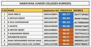 జేఈఈ మెయిన్1 ఫలితాల్లో నారాయణ విద్యాసంస్థల విద్యార్థులు ఆల్టైమ్ రికార్డు సృష్టించారని నారాయణ కాలేజీ యాజమాన్యం ప్రకటించింది. మంగళవారం విడుదలైన ఫలితాలలో మరోసారి ప్రభంజనం సృష్టించిన కర్నూలు నారాయణ విద్యార్థిని విద్యార్థులను నారాయణ విద్యా సంస్థల యాజమాన్యం ప్రశంసించింది. కర్నూలు నారాయణ కళాశాల నుండి జి. ఉషశ్రీ 99.77 పర్సంటైల్, వి. మిథున్ రెడ్డి 99.44 పర్సంటైల్, ఎన్.శివ చక్రధర్ 99.13 పర్సంటైల్, వి.సాహితి 99.05 పర్సంటైల్, బి. హృతిక్ రెడ్డి 98.68 పర్సంటైల్, పి. సుగంధిని రెడ్డి 98.47 పర్సంటైల్, మహబూబ్ బాషా 98.26 పర్సంటైల్, షేక్ మొహమ్మద్ రాయన్ వాసి 98.03 పర్సంటైల్, మొహమ్మద్ ఖాజా ఫైజ్ అహ్మద్ 98.01 పర్సంటైల్, ప్రణవ్ జాయ్ 97.85 పర్సంటైల్, ఖాజీ మహమ్మద్ ఫహాద్ 97.60 పర్సంటైల్, ఎస్.ప్రశాంత్ 97.51 పర్సంటైల్, కె.నాగశివ బాలాజి 97.45 పర్సంటైల్, ఎమ్. హర్షవర్ధన్ 97.32 పర్సంటైల్, బి. రణధీర్ 97. 32 పర్సంటైల్ సాధించారు. అలాగే 99 పర్సంటైల్ పైన నలుగురు, 98 పర్సంటైల్ పైన 9 మంది, 97 పర్సంటైల్ పైన 15 మంది, 96 పర్సంటైల్ పైన 19 మంది, 95 పర్సంటైల్ పైన 24 మంది, 90 పర్సంటైల్ పైన 52 మంది విద్యార్థులు ఆర్హత సాధించారు. ఉత్తమ ప్రతిభకనబరిచిన విద్యార్థులను నారాయణ యాజమాన్యం అభినందిచారు. ఈ కార్యక్రమంలో కళాశాల డి.జి.ఎమ్. టి. గోవర్ధన్ రెడ్డి, డీన్లు ఆంజనేయ రెడ్డి, విశ్వనాథ్ రెడ్డి, డి.వేణు గోపాల్ రెడ్డి, ప్రిన్సిపాల్ పి.సుజాత, వెంకటరాముడు, బి. విజయ మోహన్, రెవతి, ఎ.సరితసాగర్, సాంబశివారెడ్డి, రామసుబ్బారెడ్డి, అధ్యాపకులు మరియు విద్యార్థిని విద్యార్థుల తల్లిదండ్రులు పాల్గొన్నారు.